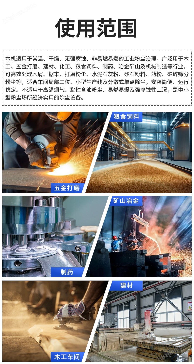 適用用途:主要用于木工家具、五金打磨、建材破碎、飼料化工、粉料包裝、水泥砂石、機(jī)械加工等行業(yè)。可收集鋸末、砂石粉塵、金屬打磨粉塵、破碎揚(yáng)塵等,有效改善車(chē)間環(huán)境,滿足環(huán)保排放要求,適用于中小型產(chǎn)塵點(diǎn)位的就地除塵與粉塵收集。